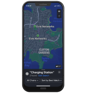 Using the Apple Maps App on your smartphone, you can include charging stations in your trip planning by selecting ‘Add stop’ and then searching for a ‘charging station’.